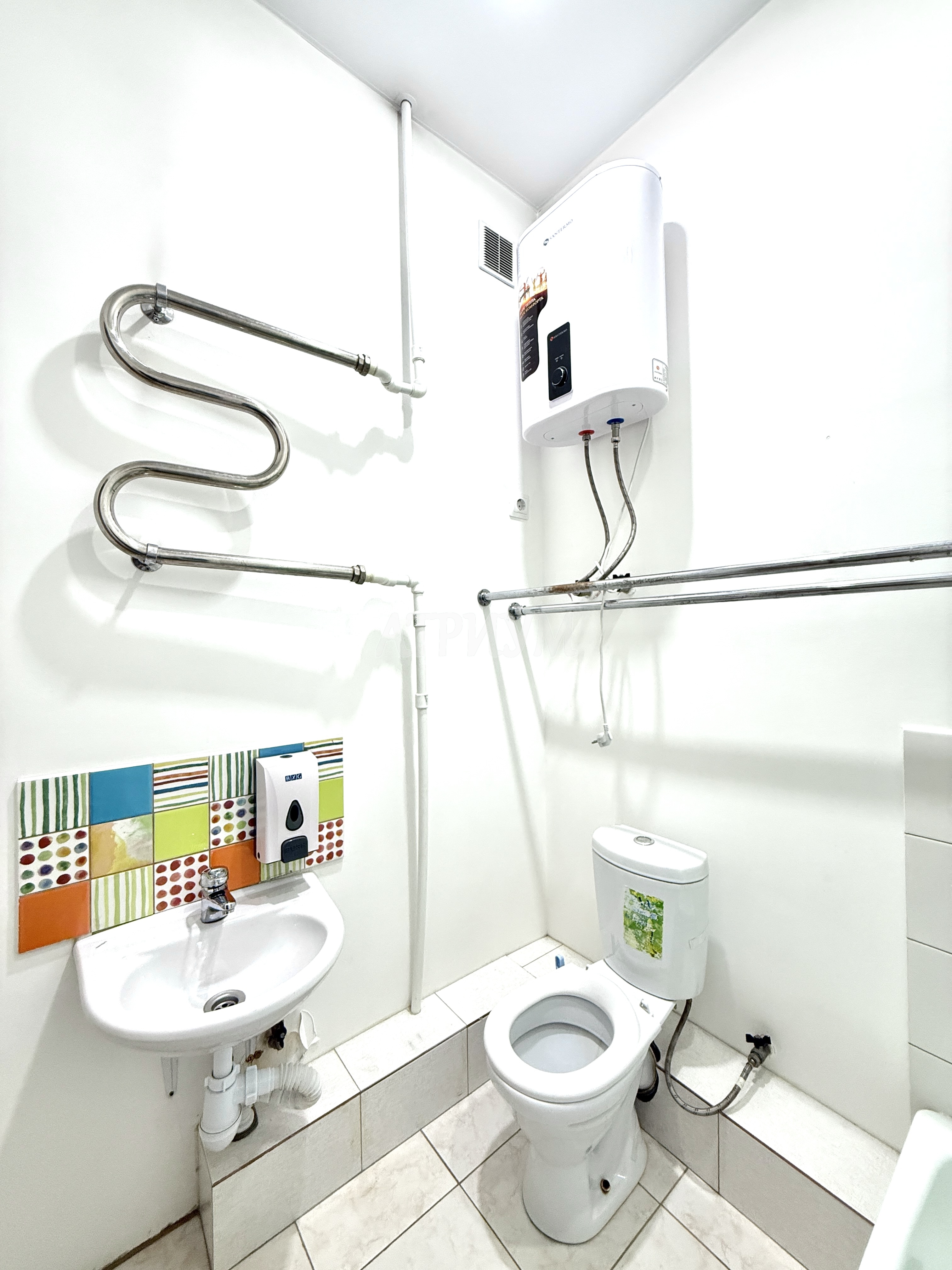 Стены и потолок ровные, пол тёплый, покрытие - линолеум, потолок натяжной с точечным освещением.
